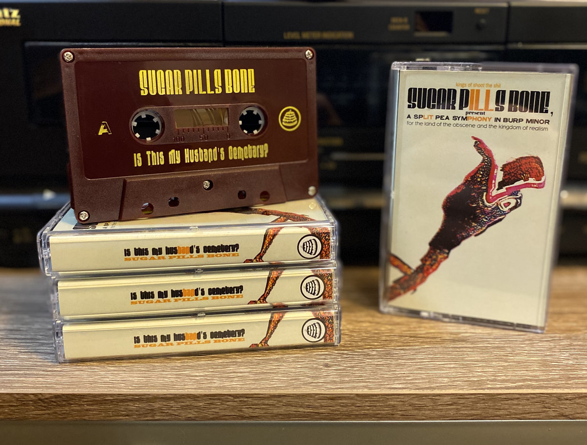 "It’s always a delight to see young bands grow. Thanks to a lucrative grant from the Global League for the Optimization of Burpwave (G.L.O.B.), the scruffy ruffians of Sugar Pills Bone have added an immense arsenal of new, mostly fictional music-making tools to their arsenal for their new tape Is This My Husband’s Cemetery?: the dysphonometer, scrotumpipes, weasel teeth, ladles, air keytar, armadillotar, badgermin, and many more. The music, as always, manifests in the delightfully sloppy form of “plunderphonics” that the group has made entirely their own, this time seeming to rely on more pure sample-collages than ever before. Across sixteen bite-sized tracks, one trips, slips, and slobbers all over an unyielding current of heavily manipulated speech, plasticky stretches of fast-forwarded tape, pop songs chopped and ground into unrecognizable giblets, infrequent but always-unidentifiable field recordings, and more. The proceedings also coagulate into something more narrative than past releases Lumb and Slack Babbath Plays Peep Durple, albeit in a very distant and surreal sense. There are temporary characters who seem to advance similar topics or themes, conversations artificially spliced to create newly inhuman interactions, and the consistent presence of news bulletins and other familiar cultural or historical markers makes one feel as though they’re witnessing something actually happen, even if it’s nearly or completely impossible to decipher what that “something” is. The simultaneous conceptual absurdity and purely musical/textural appeal in this ridiculous project’s creations, especially this one, is something I truly value and enjoy. It also, I think, makes a case for my belief that the humorlessness of experimental music as a whole has been tremendously overstated and misframed. In any artistic medium, humor is not something to either vacuum out or forcibly, and therefore awkwardly acknowledge, but instead a useful—ultimately unnecessary, yes, but useful—flavor to harness within your work to the extent that you so choose. It augments, structures, changes; it does not taint or reduce or trivialize. Humor is also not an element that should be considered a gimmick or entirely context-based—I’m certain that even if Sugar Pills Bone’s releases were distributed without any sort of outlandish verbal preface, bizarre track titles, or colorful artwork, they would still be hilarious, because, as is always the case, the observer ultimately generates their own meaning (and their own laughter)." - Noise Not Music (Jack Davidson).